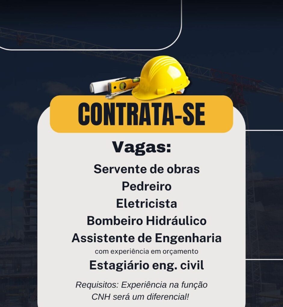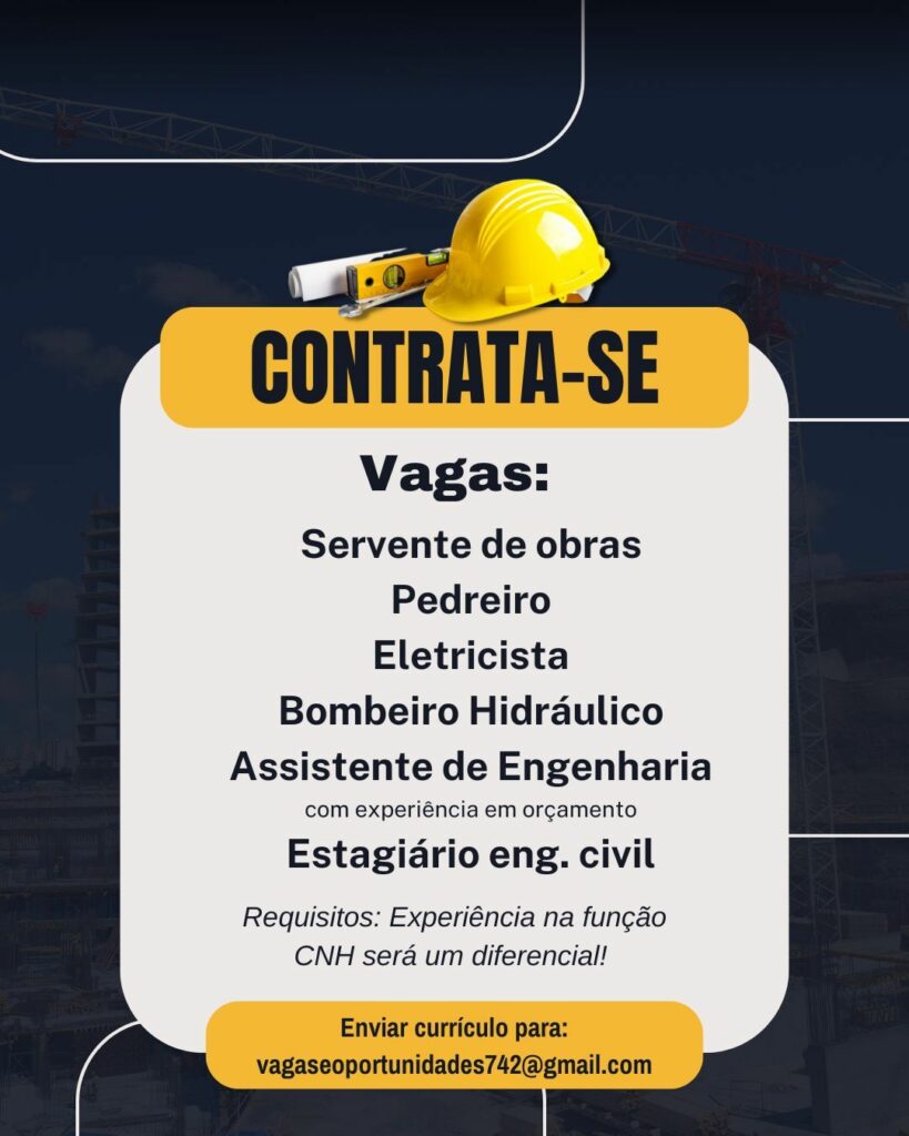 Empresa seleciona para vaga de Servente de obras, Pedreiro, Eletricista, Bombeiro hidráulico, Assistente de engenharia, Estagiário eng civil; Envie seu currículo!