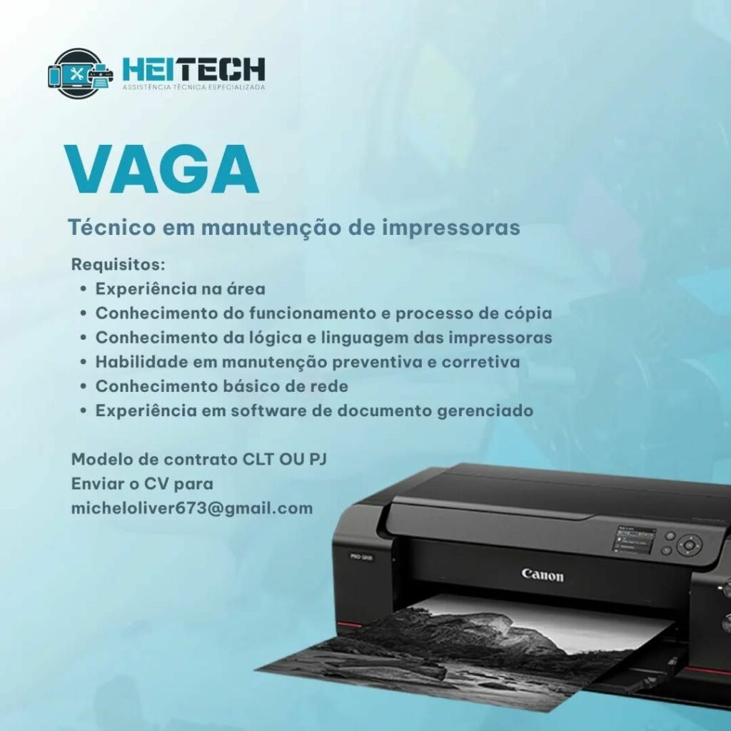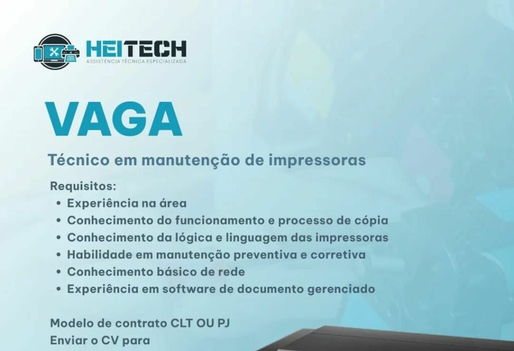 Empresa seleciona para vaga de Técnico em Manuntenção de impressora; Envie seu currículo!