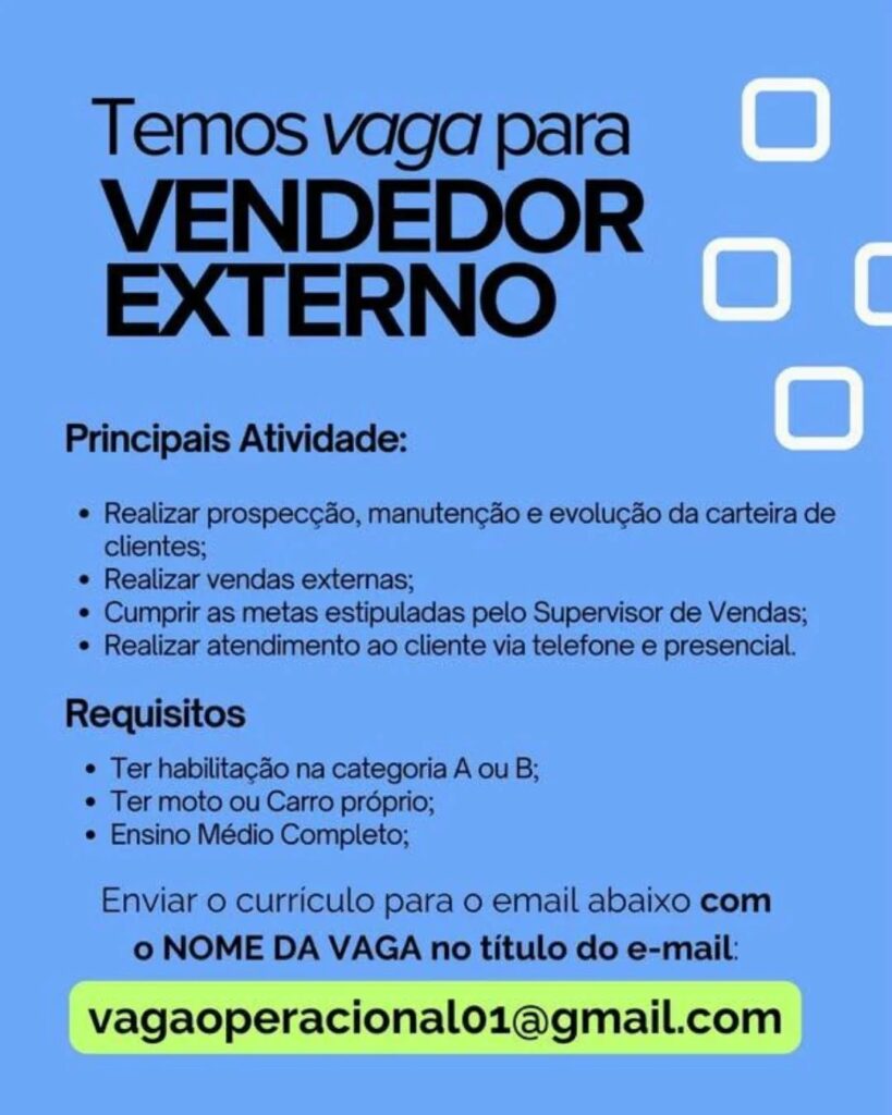 Empresa seleciona para vaga de Vendedor externo; Envie seu currículo!