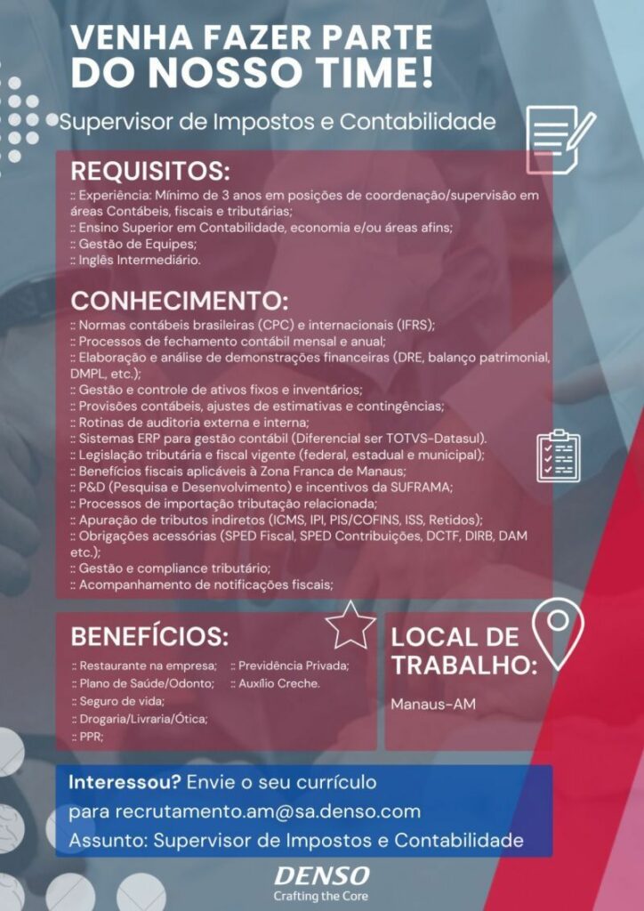 Empresa seleciona Supervisor de impostos e contabilidade; Envie seu currículo!