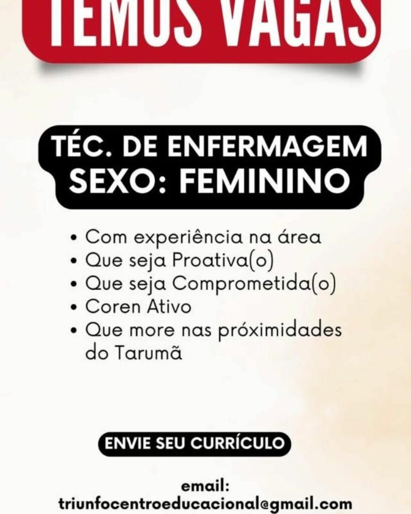 Empresa seleciona Téc. De enfermagem feminino; Envie seu currículo!