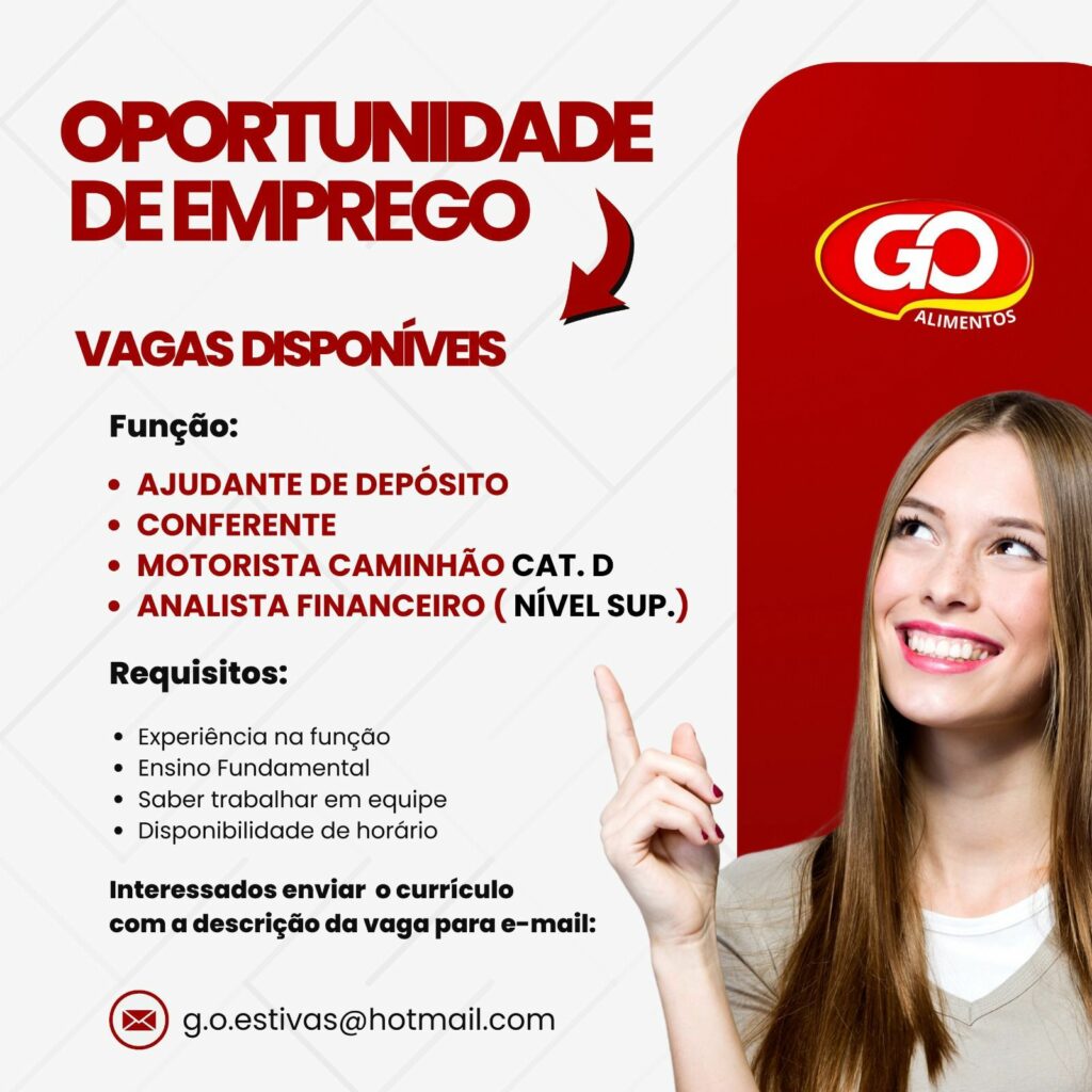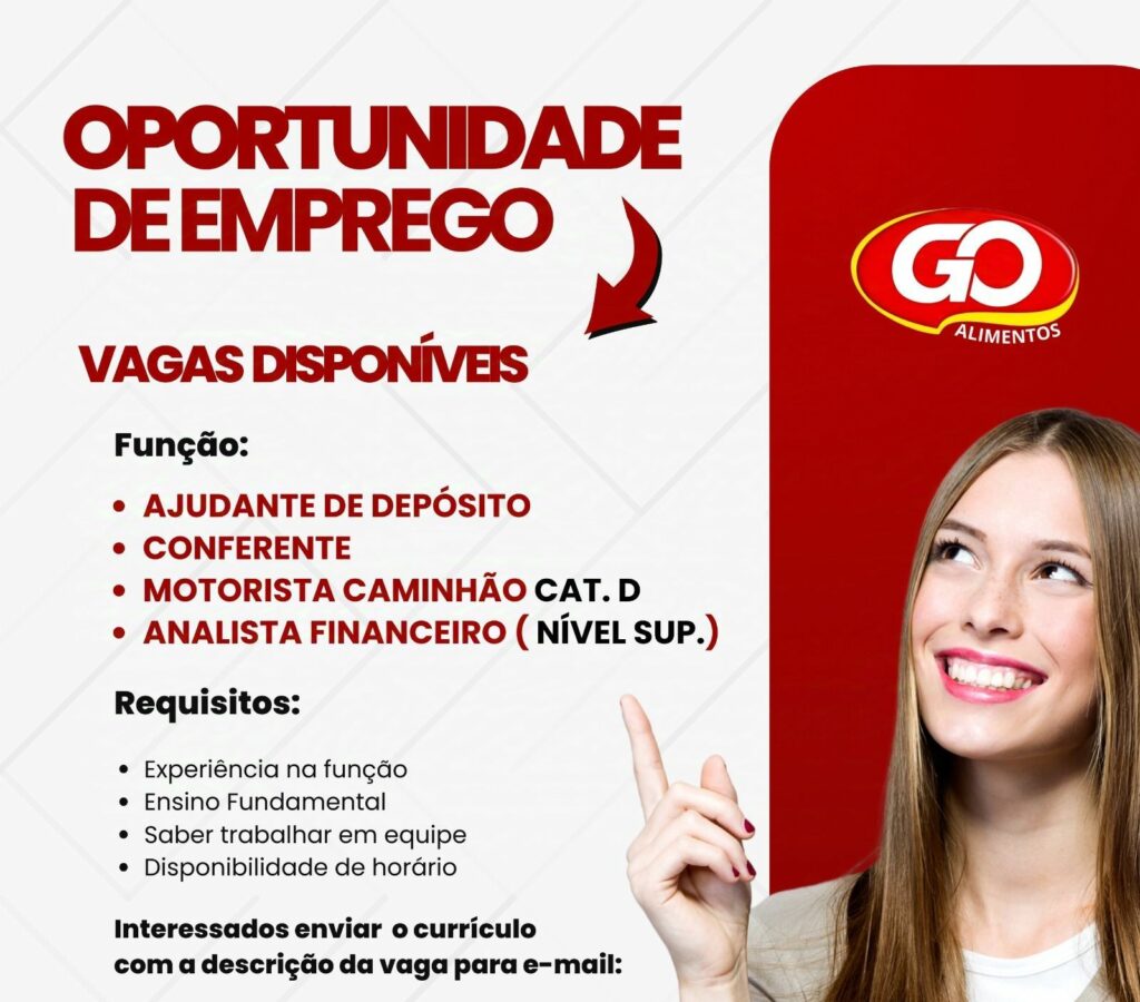G.O alimentos seleciona Ajudante de depósito, Conferente, Motorista caminhão, Analista financeiro; Envie seu currículo!