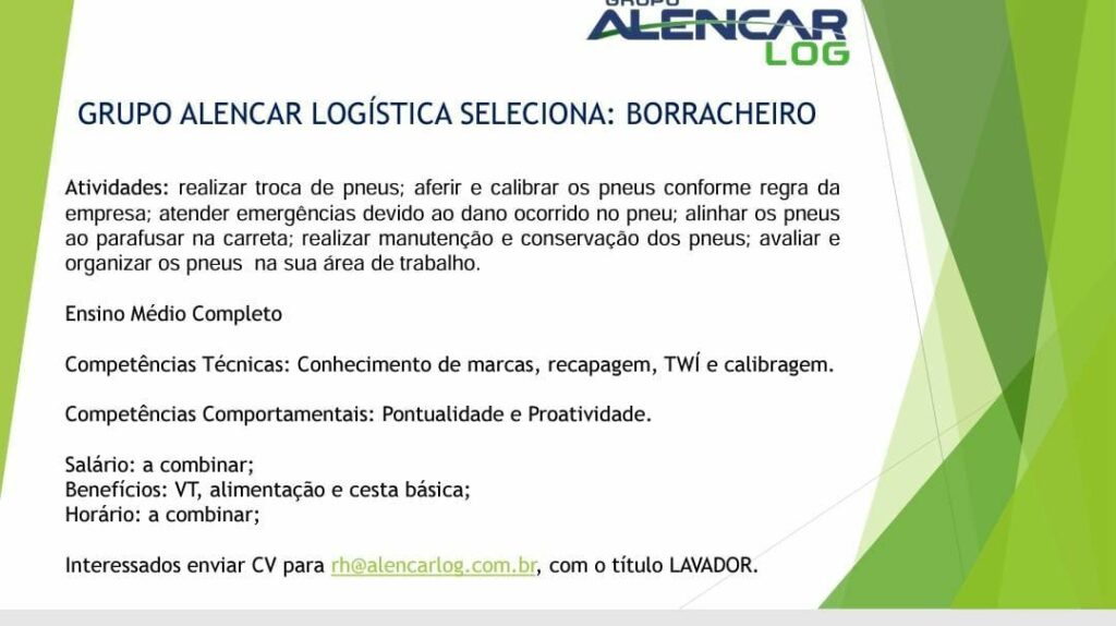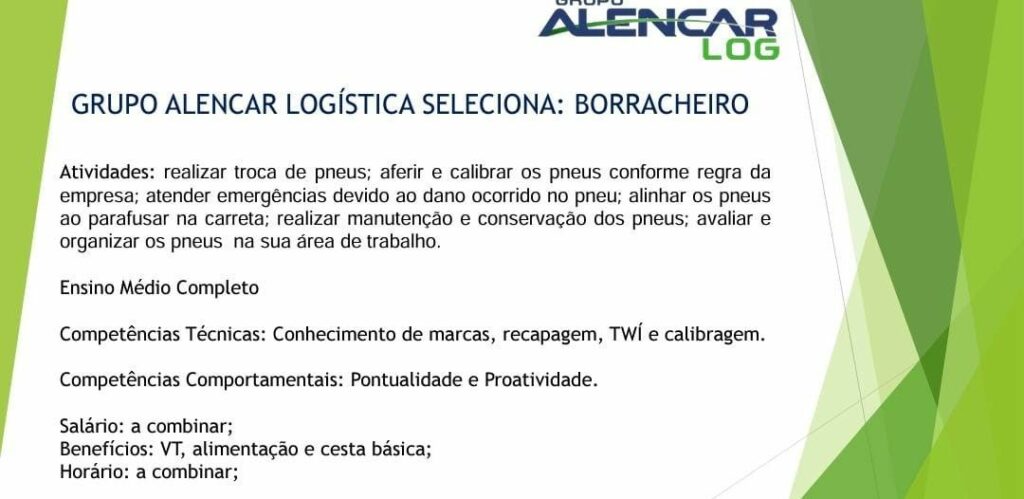 Grupo Alencar logística contrata Borracheiro; Envie seu currículo!