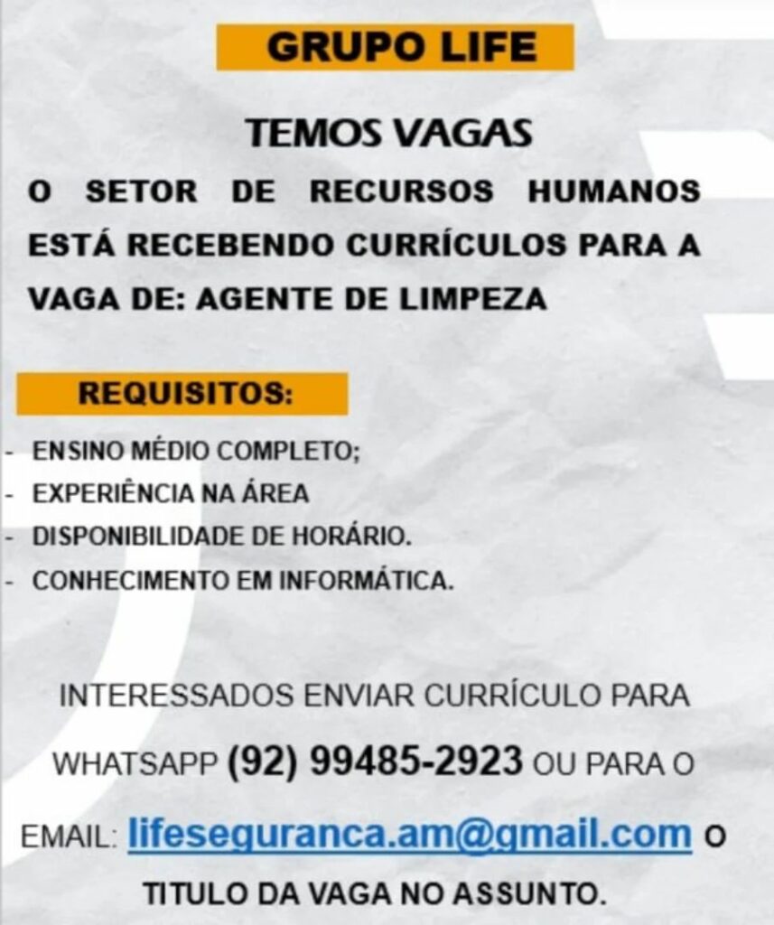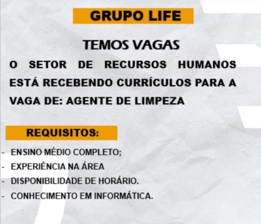 Grupo Life seleciona Agente de limpeza; Envie seu currículo!