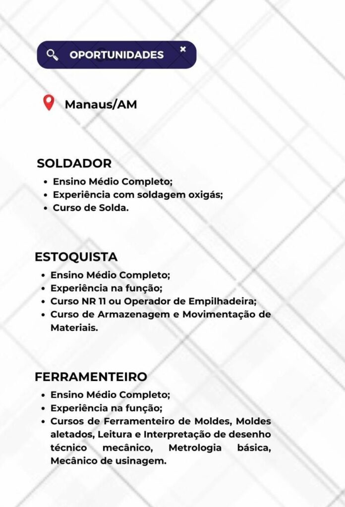 • Eletricista, Serralheiro e mais 110 vagas de emprego no Sine Amazonas