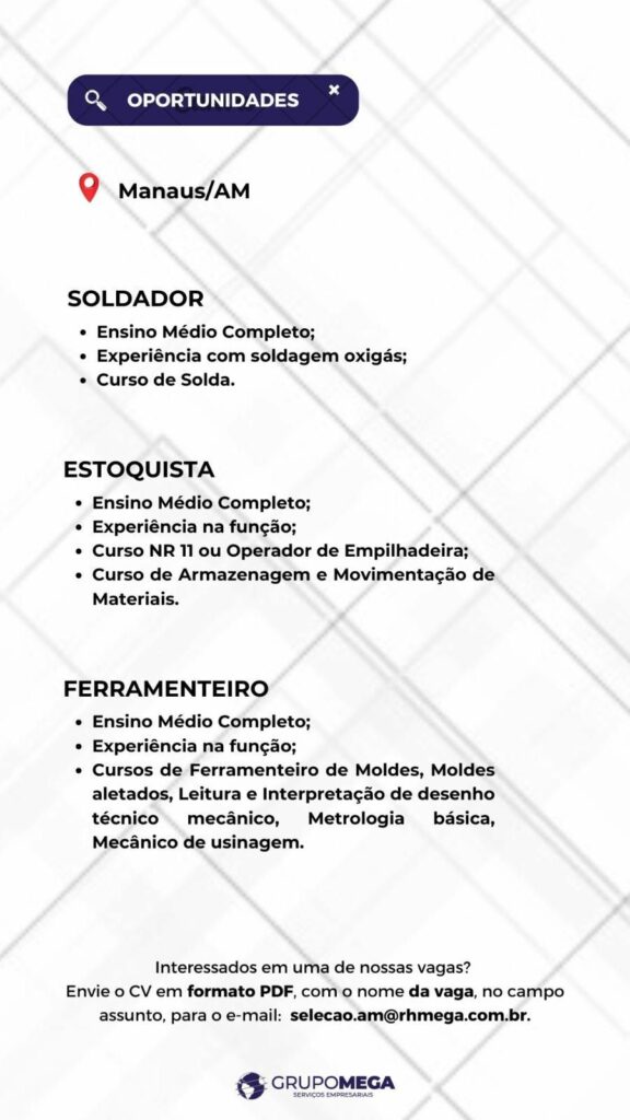 Grupo Mega seleciona Soldador, Estoquista, Ferramenteiro; Envie seu currículo!