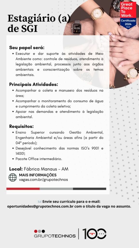 Grupo Technos seleciona para Estagiário (a) de SGI; Envie seu currículo!