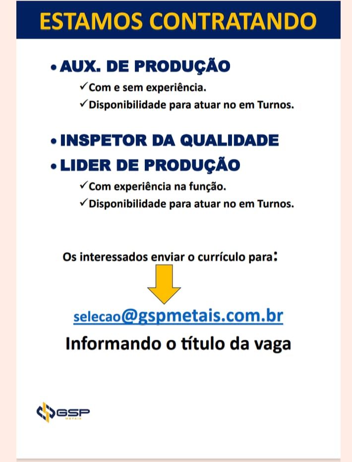 GSP metais deseja contratar Auxiliar de produção, Líder de Produção, Inspetor da qualidade; Envie seu currículo!