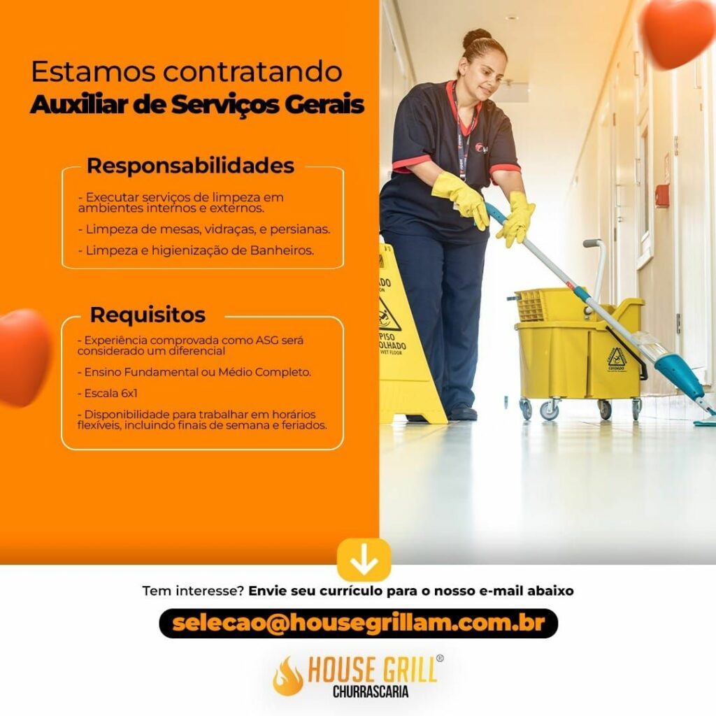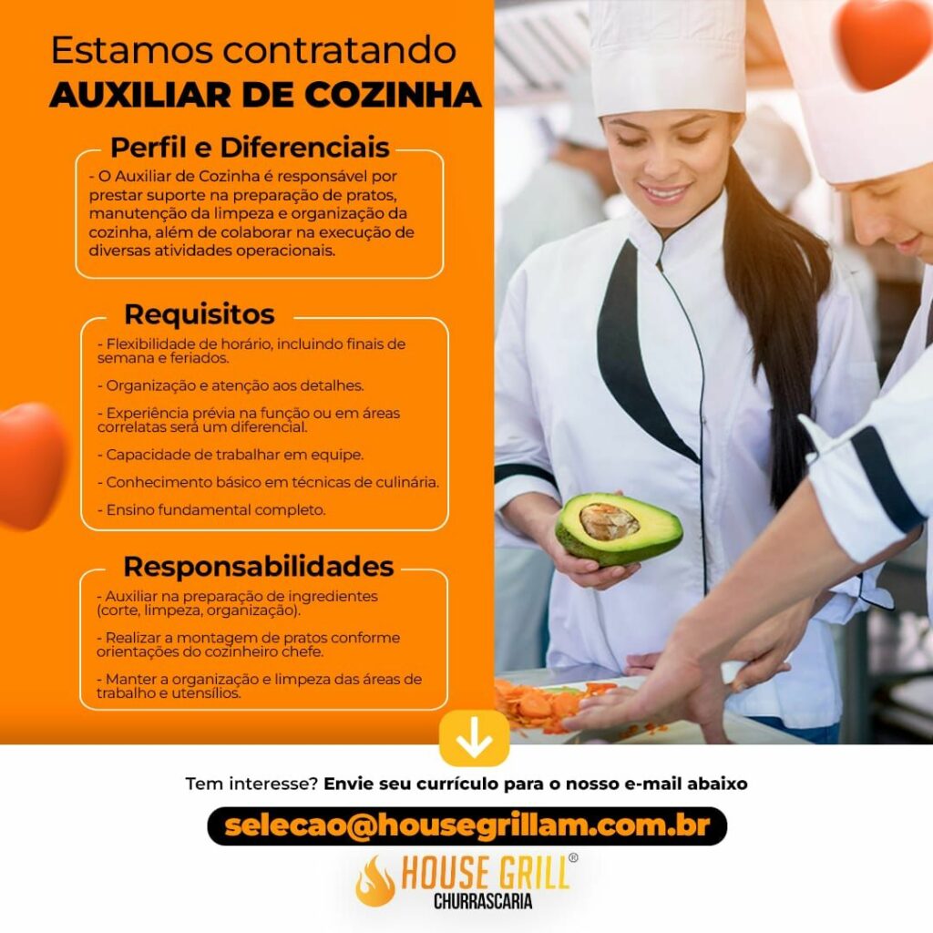 House Grill churrascaria seleciona Auxiliar de cozinha, Auxiliar de serviços gerais; Envie seu currículo!