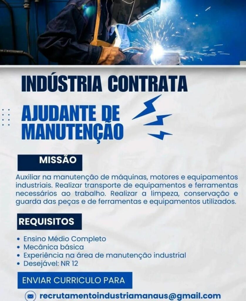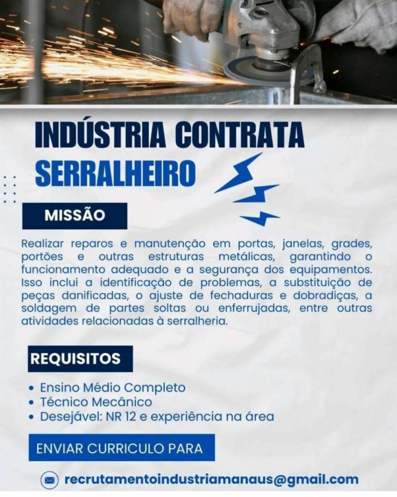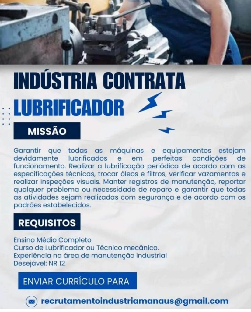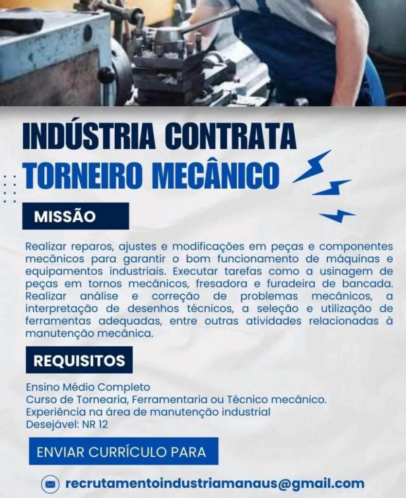 Indústria contrata Torneiro mecânico, Serralheiro, Ajudante de Manuntenção, Almoxarife, Lubrificador; Envie seu currículo!
