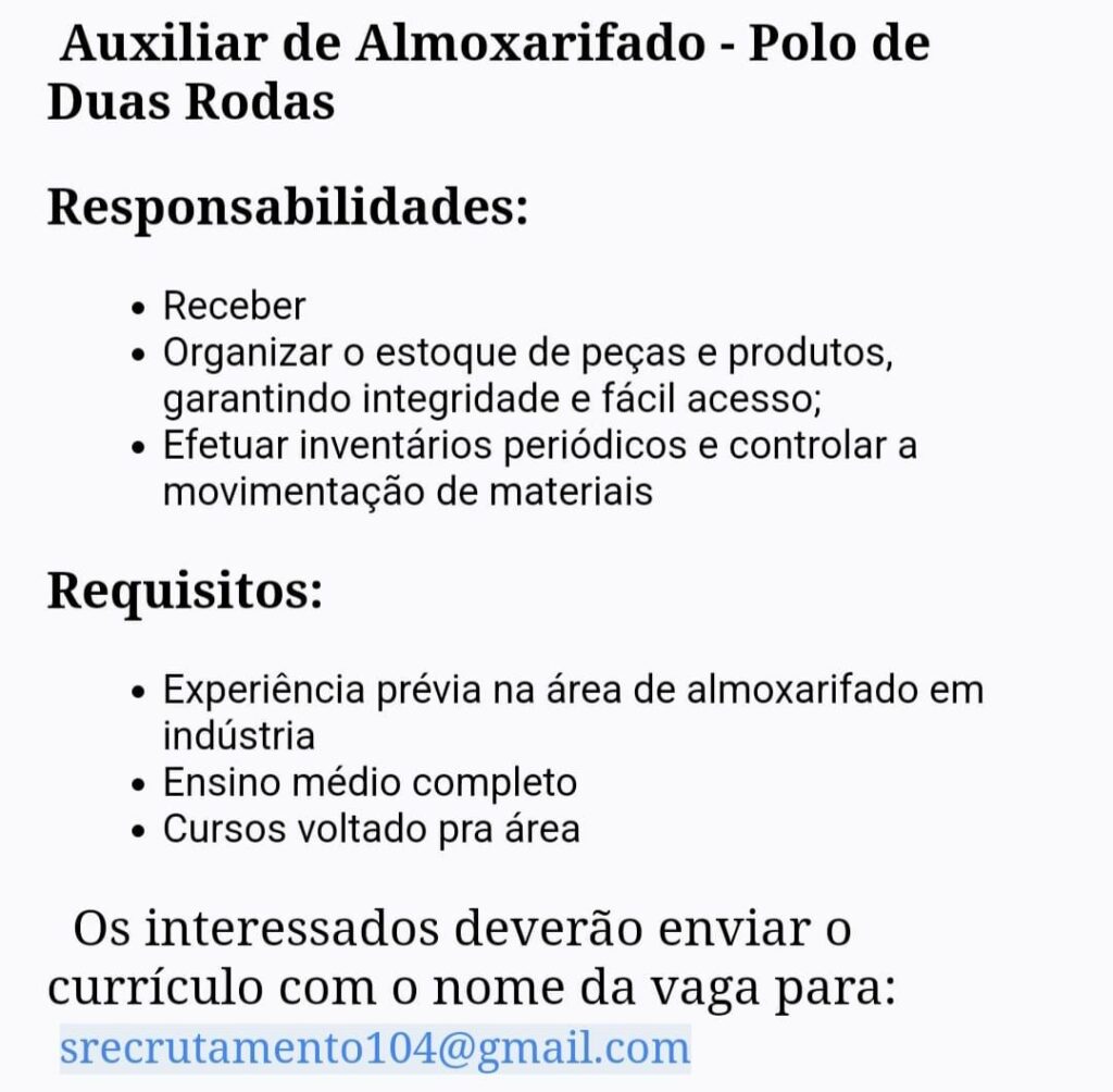 Indústria do polo de duas rodas contrata Auxiliar de almoxarifado; Envie seu currículo!