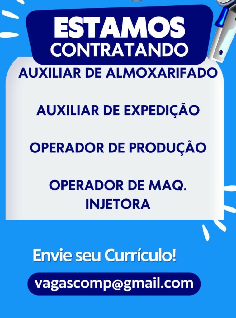 Indústria está selecionando Auxiliar de almoxarifado, Auxiliar de expedição, Operador de produção, Operador de máquina injetora; Envie seu currículo!
