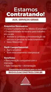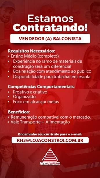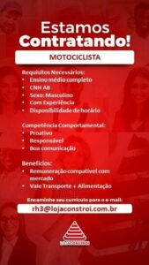 Lojas Constrói seleciona Vendedor (a) Balconista, Motociclista, Auxiliar de serviços gerais; Envie seu currículo!