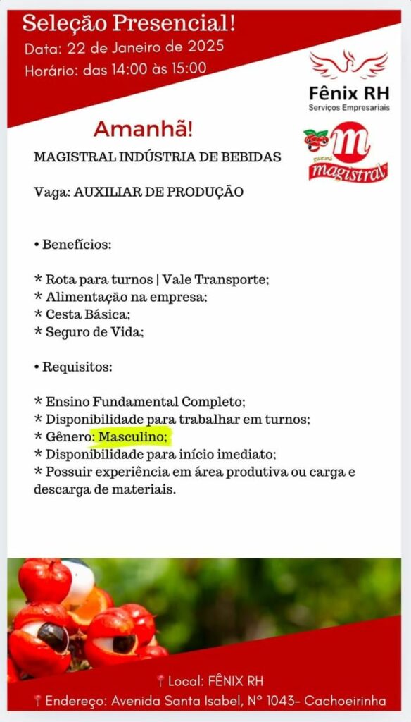 Magistral indústria de Bebidas deseja contratar Auxiliar de produção; Envie seu currículo!
