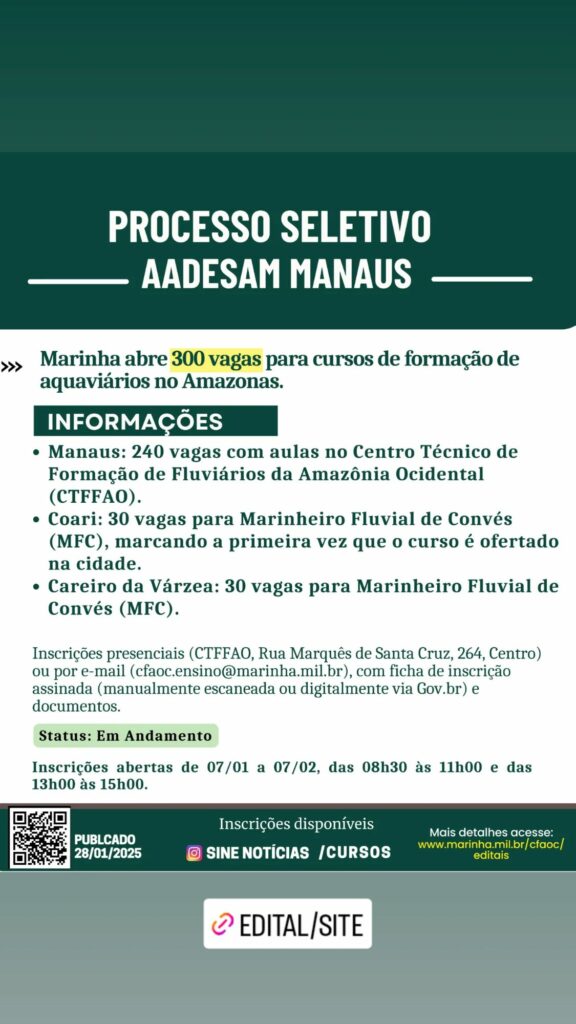 Marinha abre 300 vagas para cursos de formação de aquaviários no Amazonas