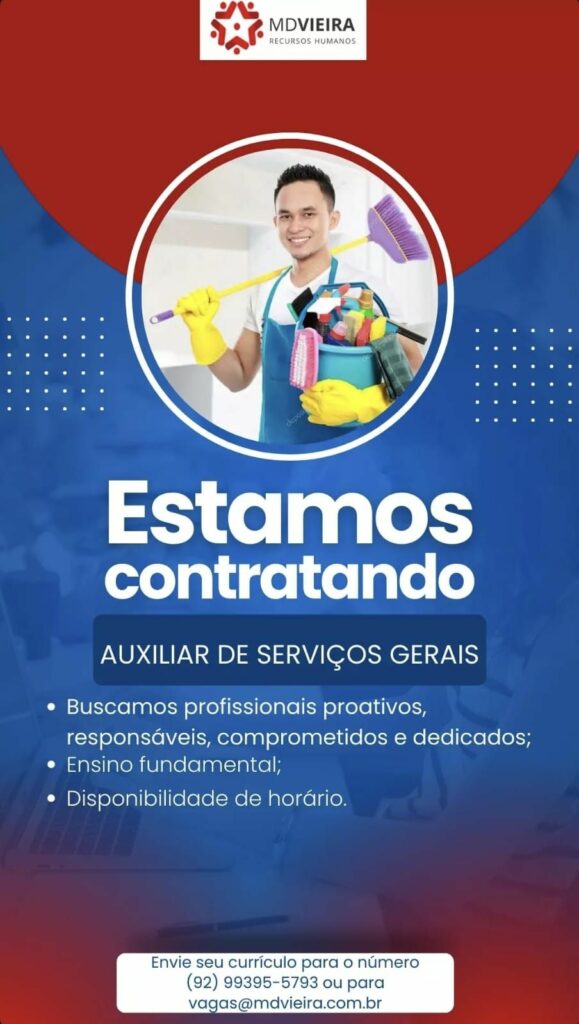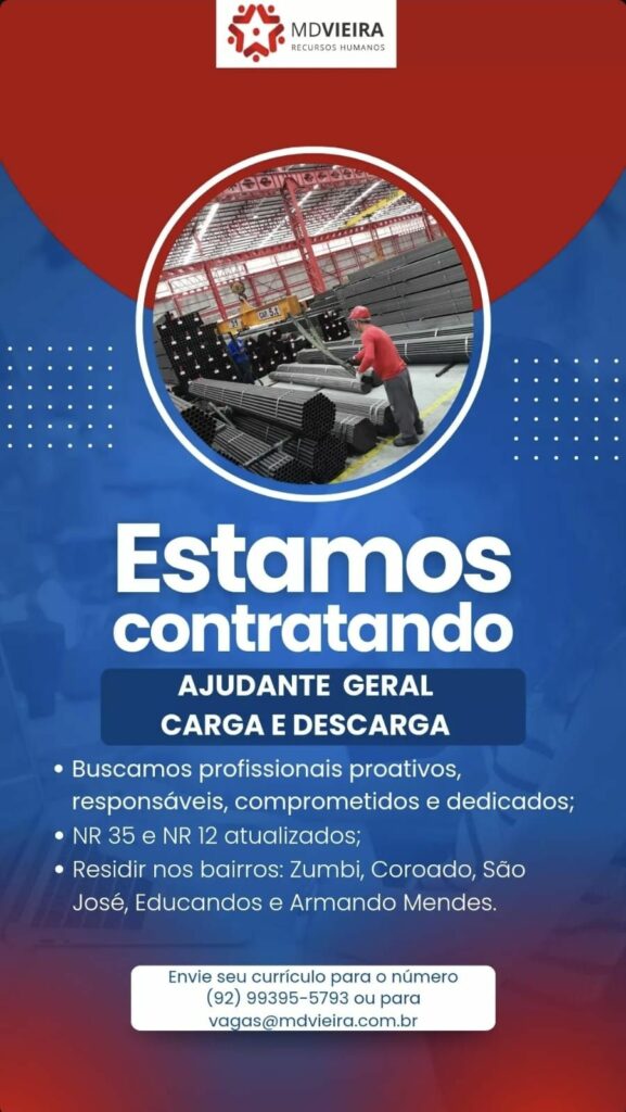 MD Vieira deseja contratar Ajudante geral carga e descarga, Auxiliar de serviços gerais; Envie seu currículo!