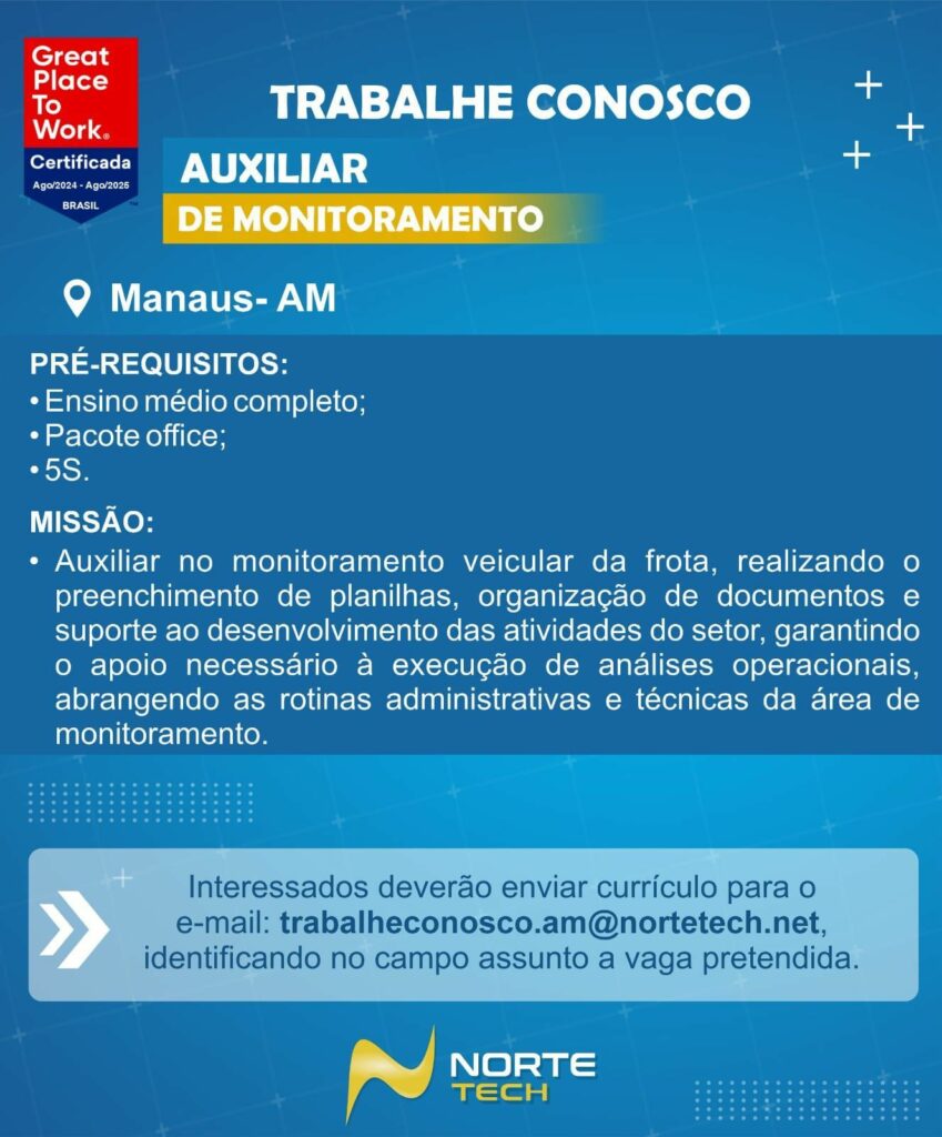 Norte Tech seleciona Auxiliar de monitoramento, Assistente administrativo lll; Envie seu currículo!