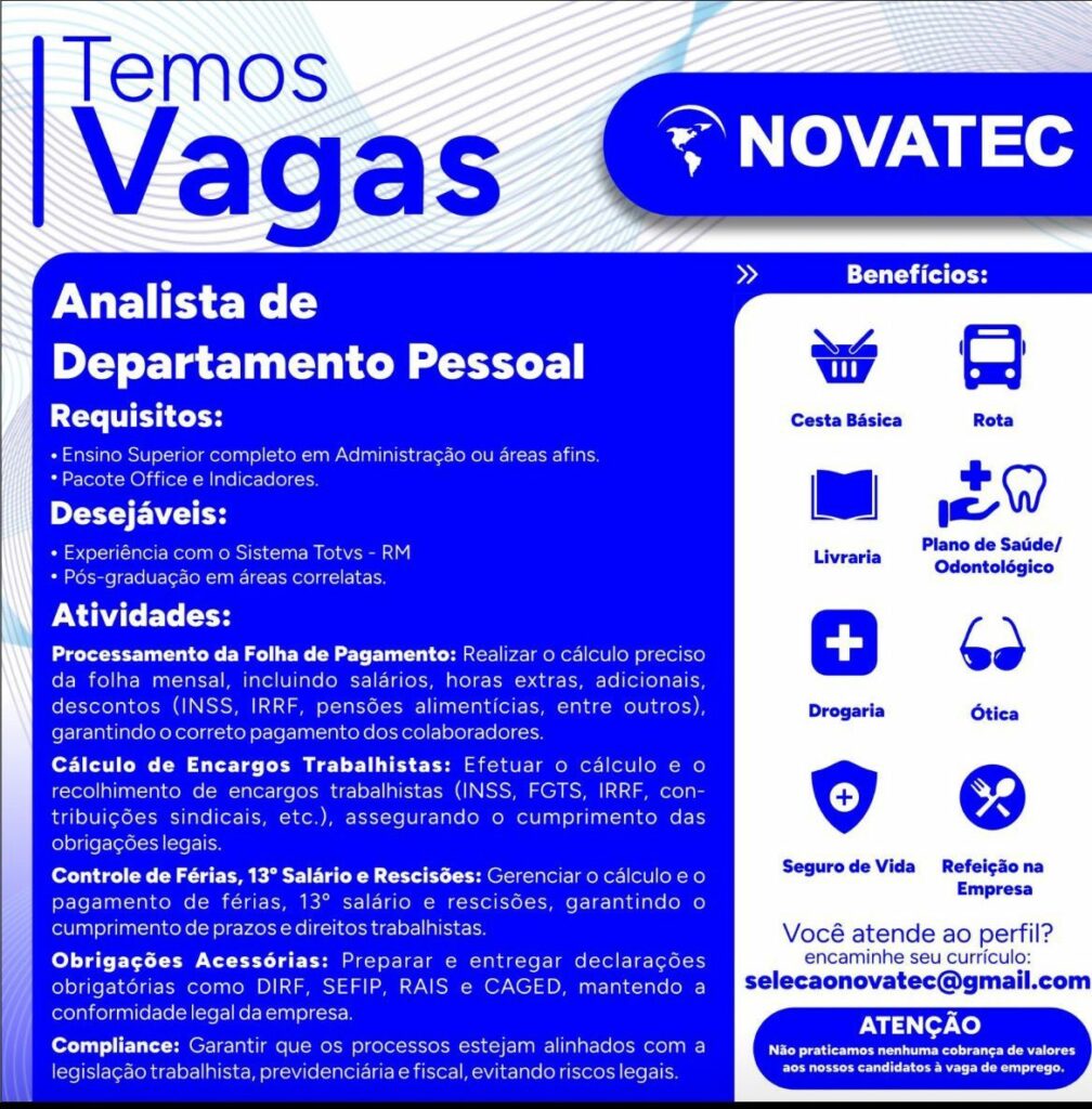 Novatec seleciona Analista de departamento pessoal; Envie seu currículo!