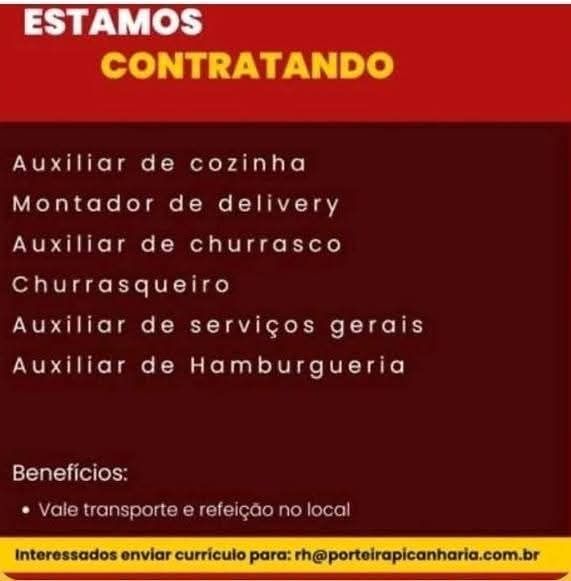 Porteira picanha seleciona Auxiliar de cozinha, Montador de delivery, Auxiliar de churrasco, Churrasqueiro, Auxiliar de serviços gerais, Auxiliar de Hamburgueria; Envie seu currículo!