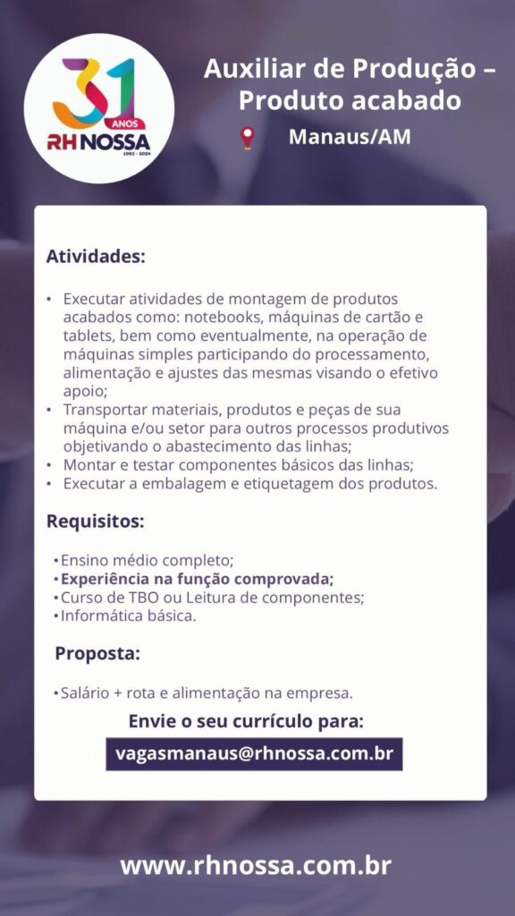 Rh abre seleção para vaga de Auxiliar de produção; Envie seu currículo!