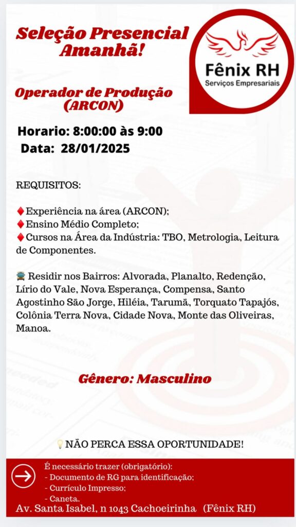 Rh abre seleção para Montador de produção ll solda, Alimentador de produção; Envie seu currículo!