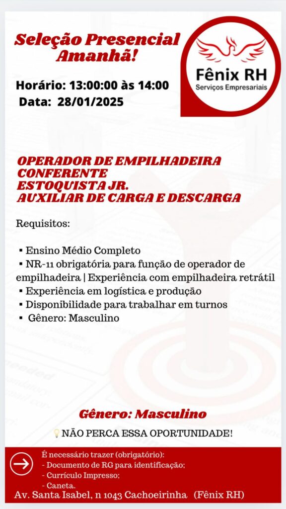 Rh está selecionando Operador de produção, Operador de empilhadeira, Conferente, Estoquista Jr, Auxiliar de carga e descarga; Envie seu currículo!