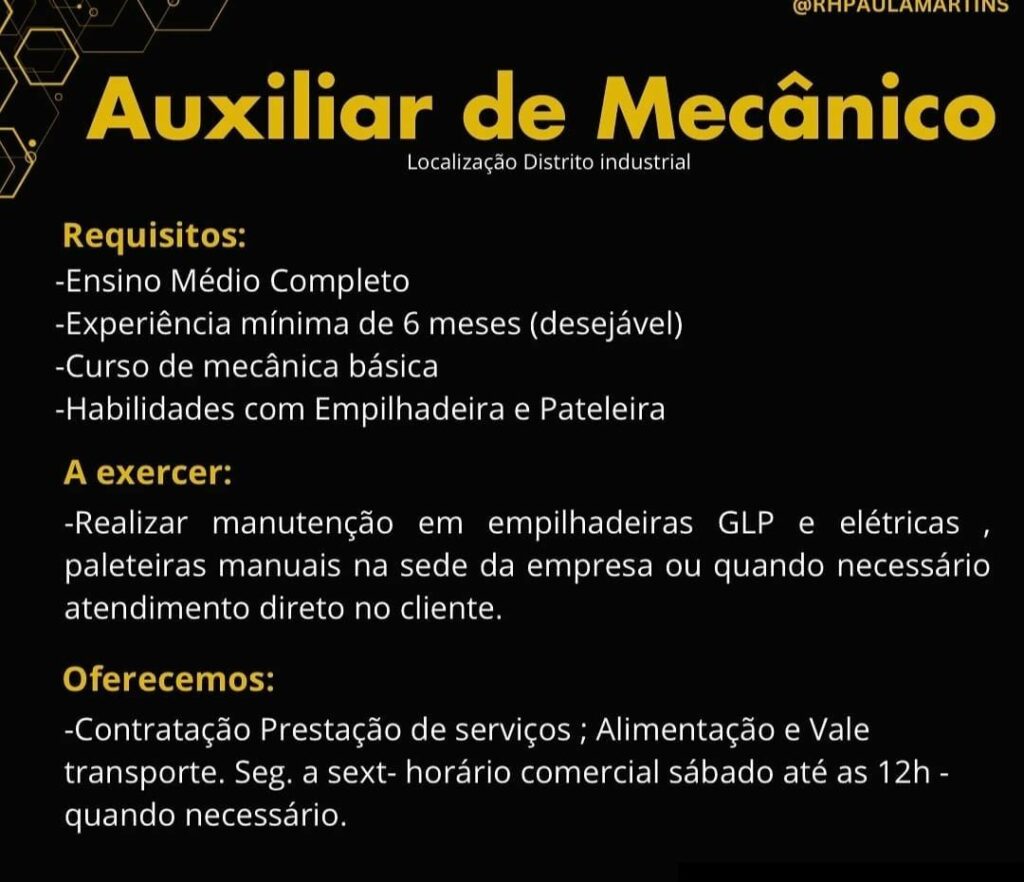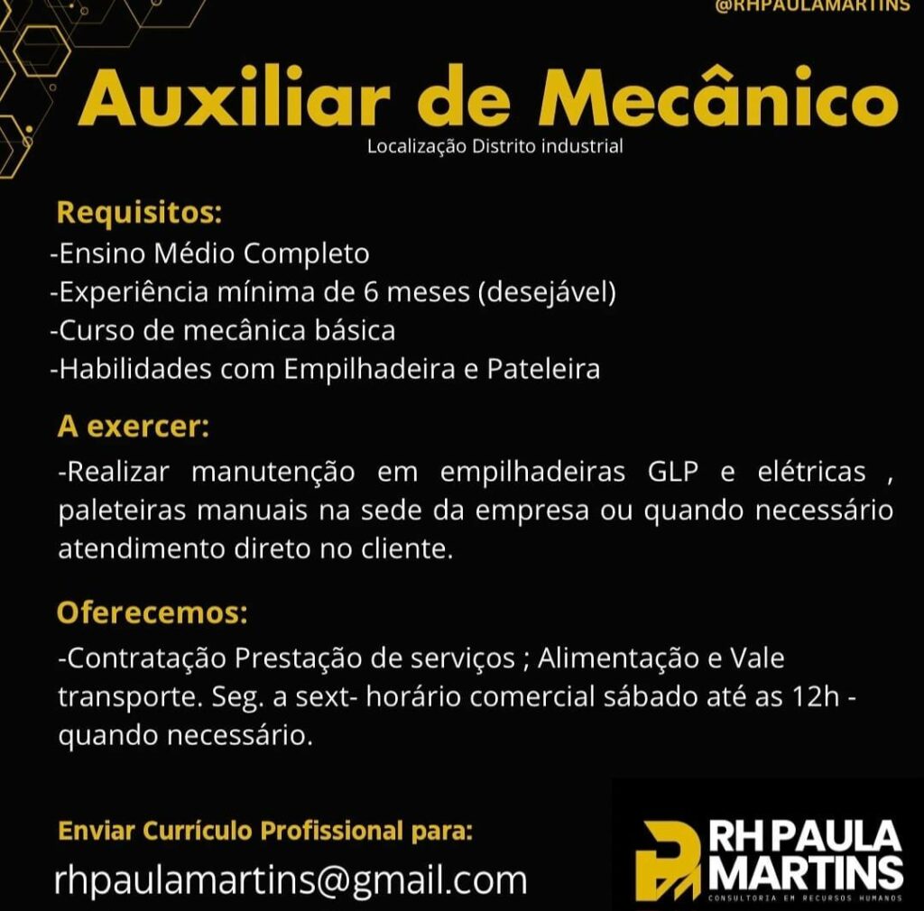 Rh está selecionando para vaga de Auxiliar de mecânico; Envie seu currículo!