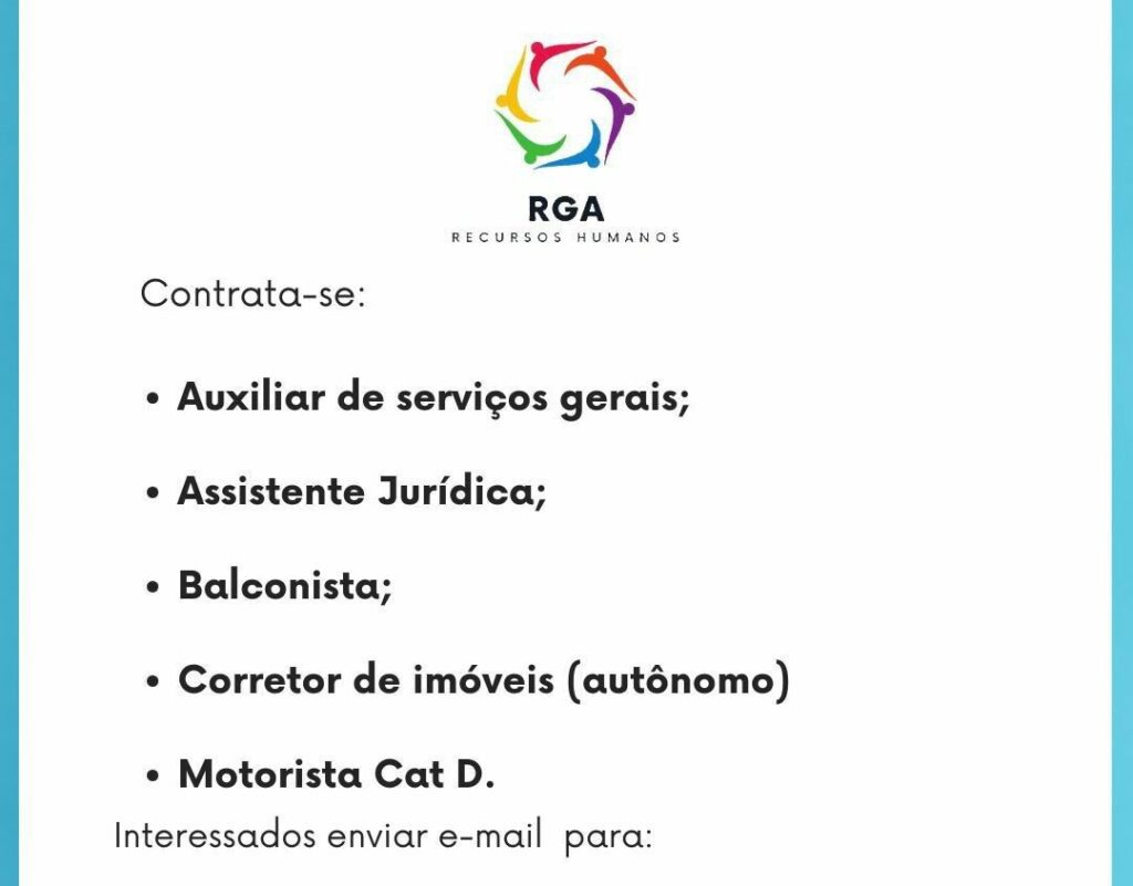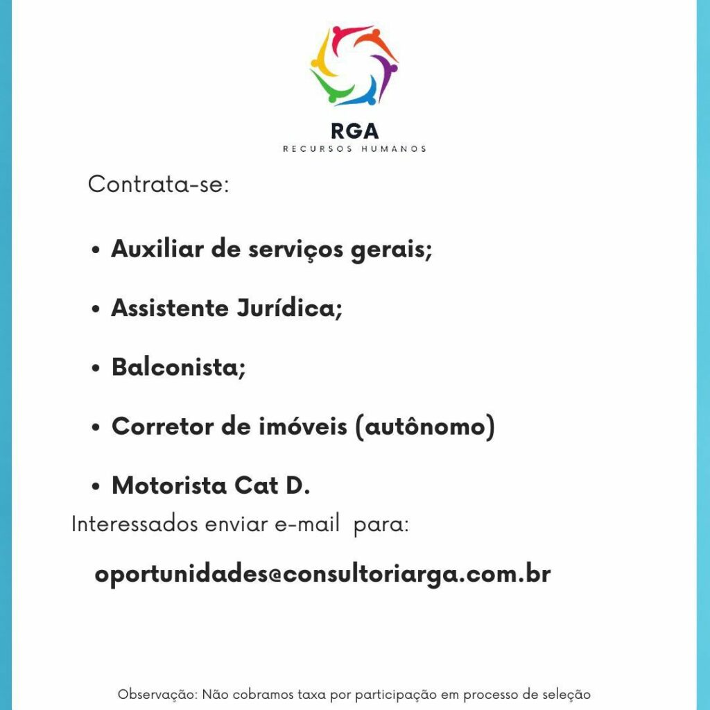 Rh seleciona Auxiliar de serviços gerais, Assistente jurídica, Balconista, Corretor de imóveis autônomo, Motorista Cat D; Envie seu currículo!