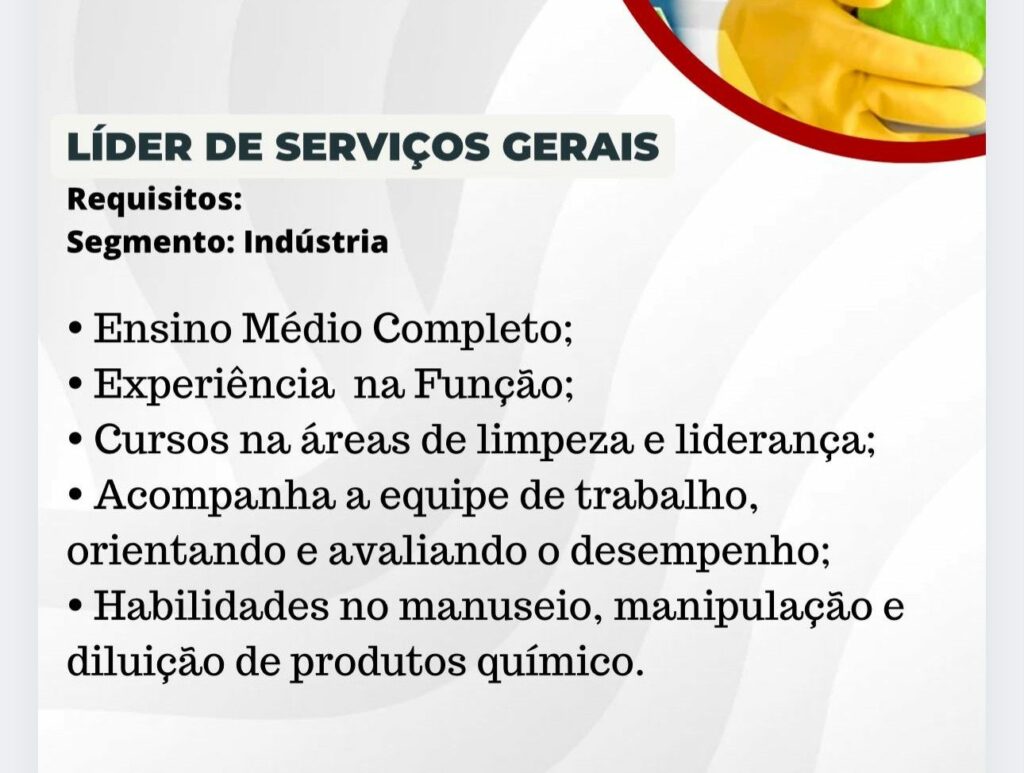 Rh seleciona para vaga de Líder de serviços gerais; Envie seu currículo!