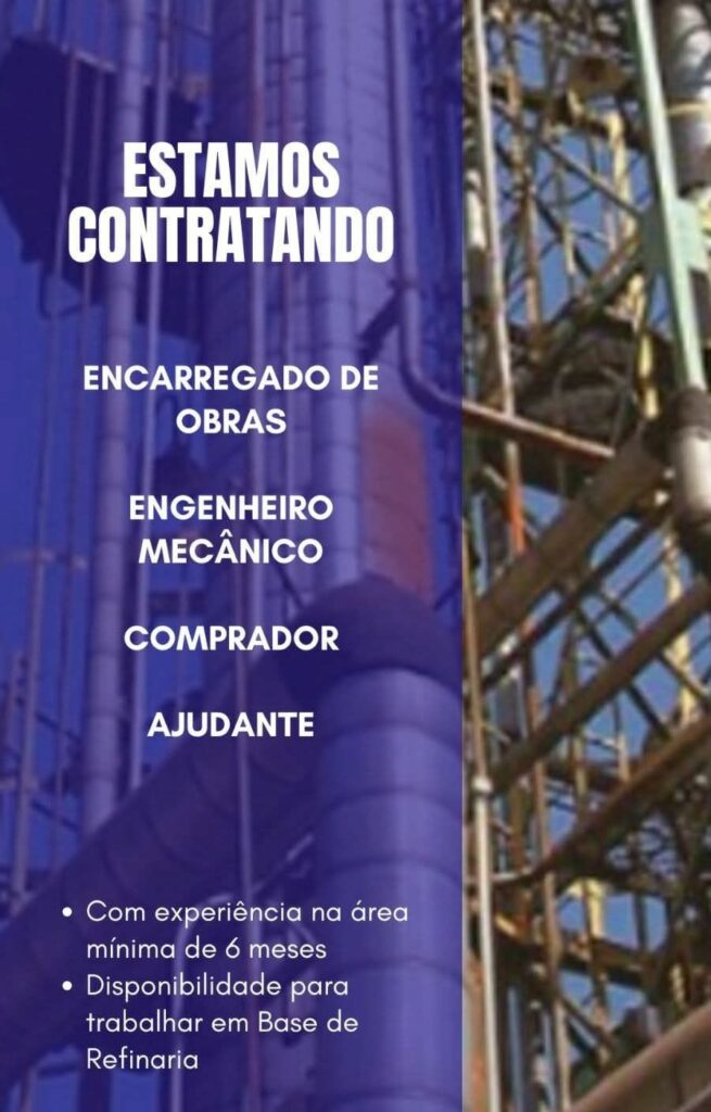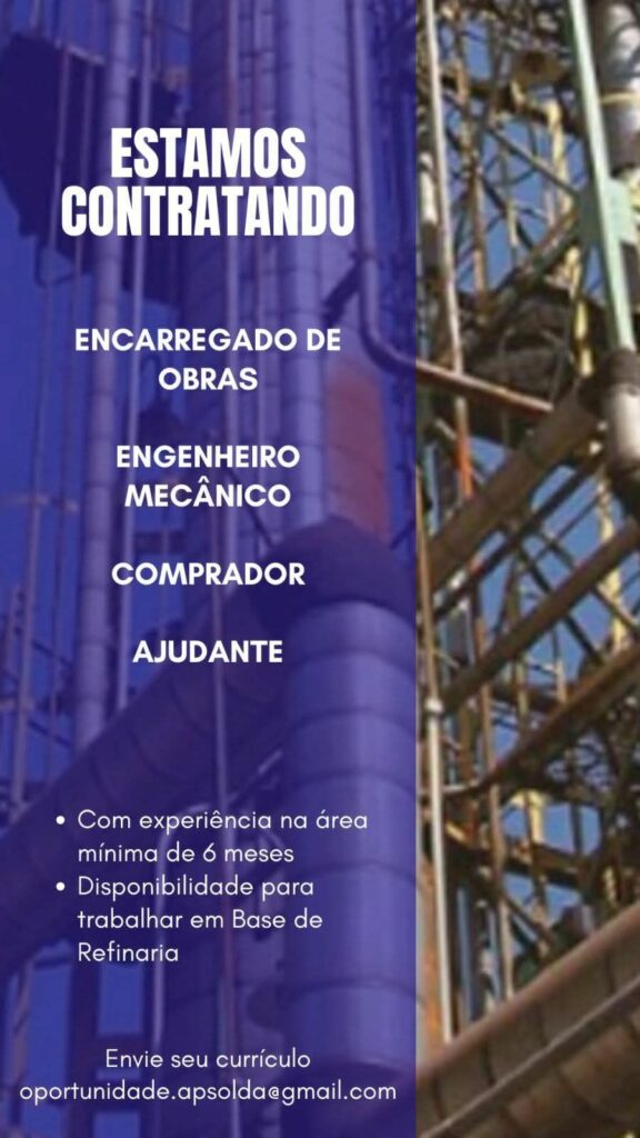 Seleção para seguintes vagas Encarregado de obras, Engenheiro mecânico, Comprador, Ajudante; Envie seu currículo!
