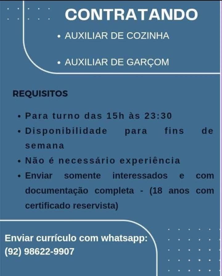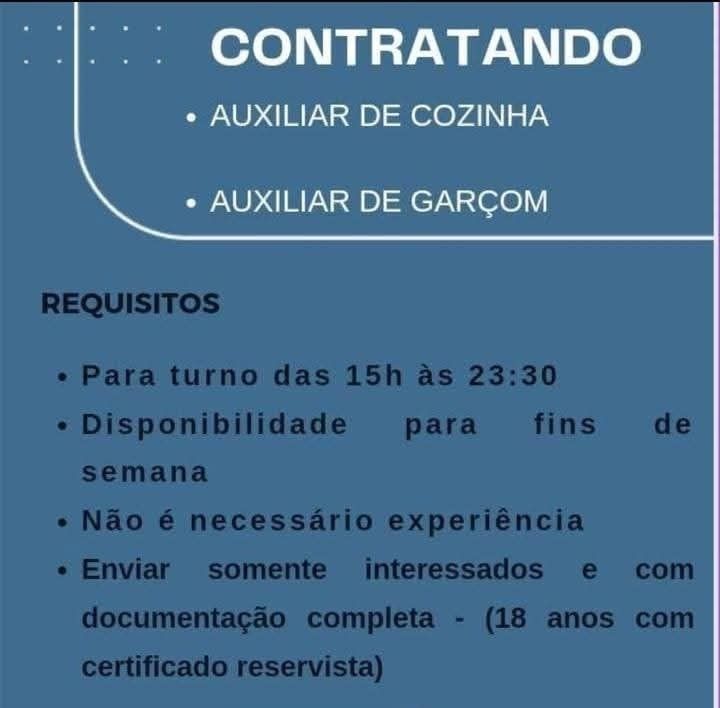 Seleção para vaga de Auxiliar de cozinha, Auxiliar de garçom; Envie seu currículo!