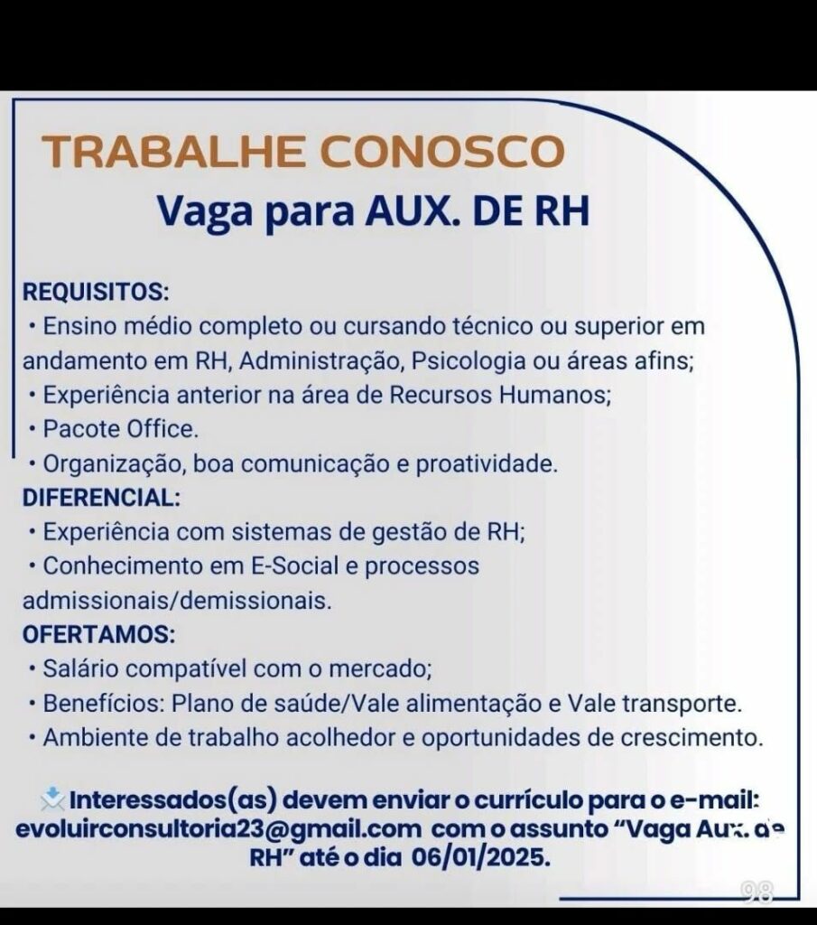 Seleção para vaga de Auxiliar de RH; Envie seu currículo!