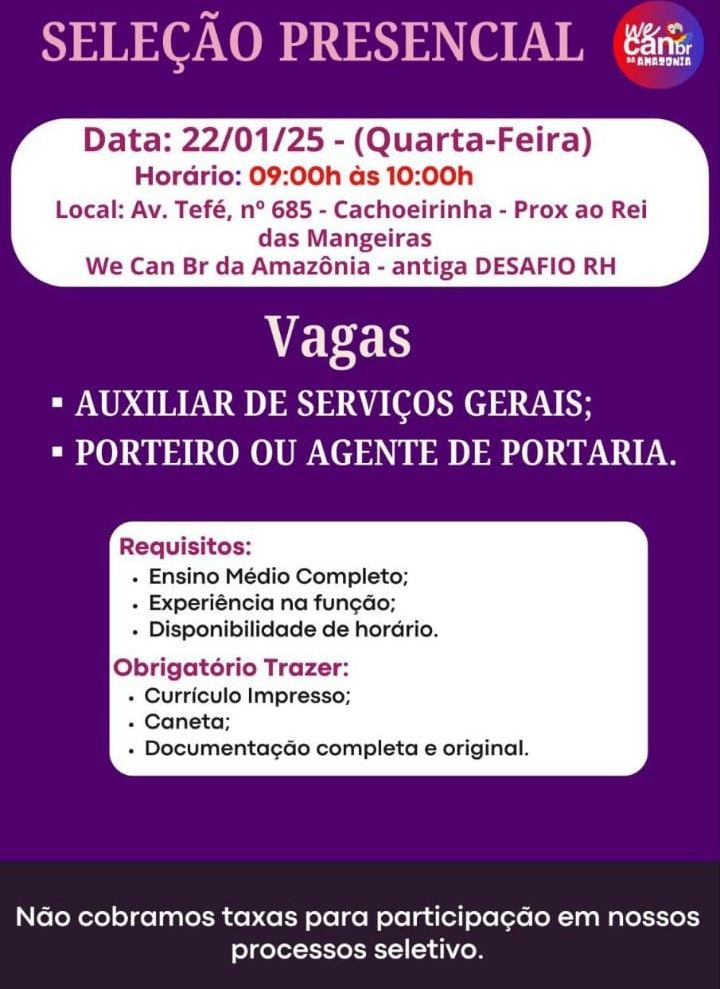 Nunca pague qualquer quantia para participar de um processo para que seja selecionado. Não compre nenhum curso, apostilas ou serviços que prometem participação na seleção ou contratação de uma vaga. E nunca insira dados bancários, cartões ou envie documentos por e-mail ou através de sites que não reconhecem. Não nos responsabilizamos por nenhum tipo de pagamento efetuado.