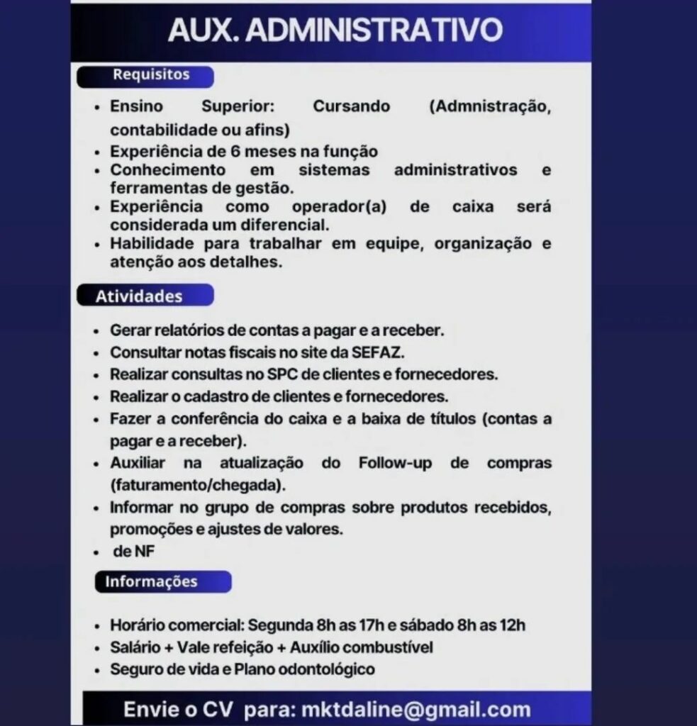 Seleção para vaga de Auxiliares administrativo; Envie seu currículo!