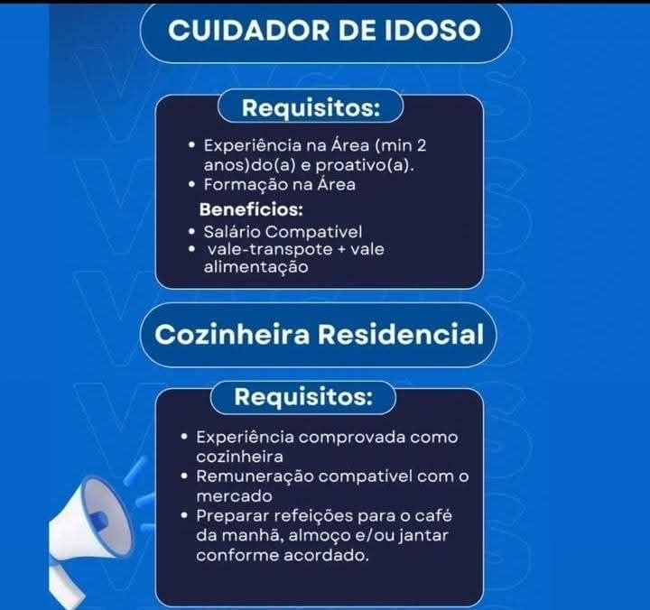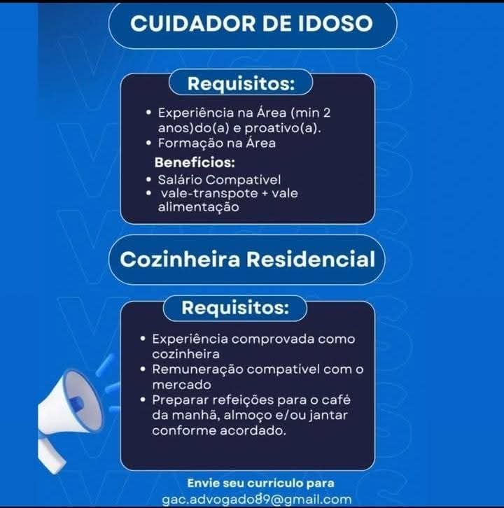 Seleção para vaga de Cuidador de Idoso, Cozinheira residencial; Envie seu currículo!