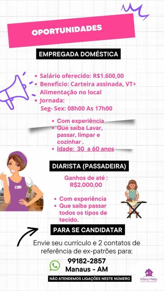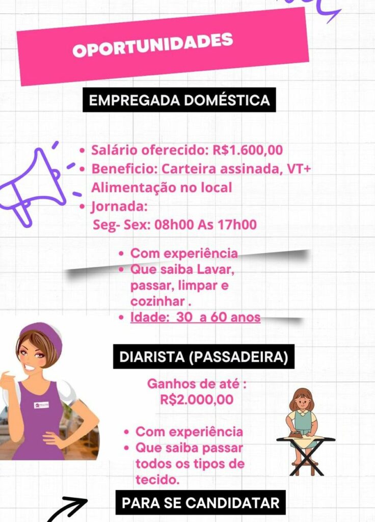 Seleção para vaga de Empregada doméstica, Diarista passadeira; Envie seu currículo!