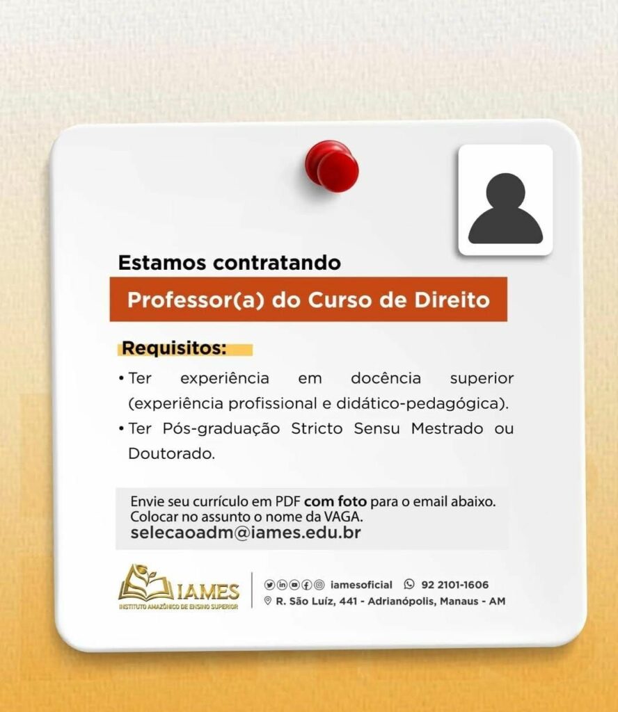 Seleção para vaga de Professor (a) do curso de Direito; Envie seu currículo!