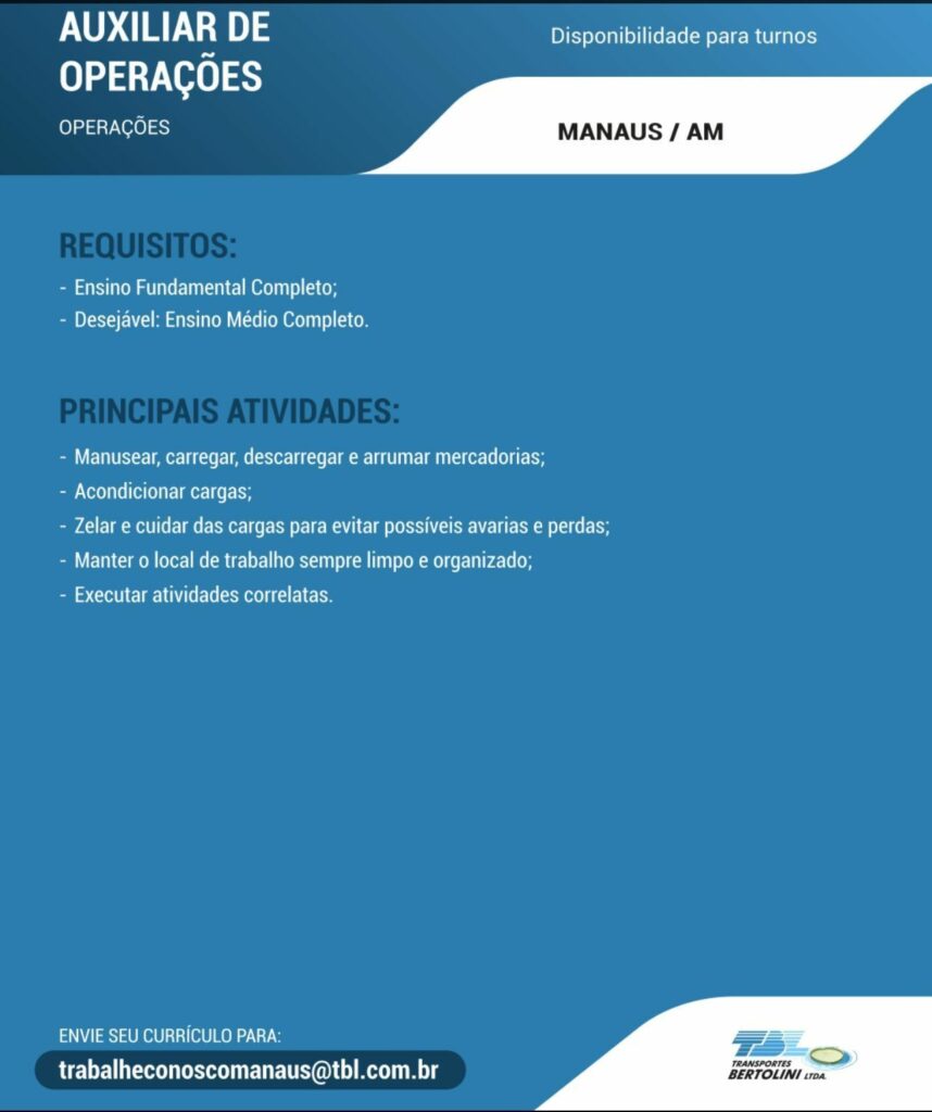 Transporte Bertolini Ltda seleciona Auxiliar de operações; Envie seu currículo!