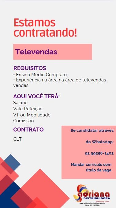 Adriana distribuidora seleciona Televendas; Envie seu currículo!