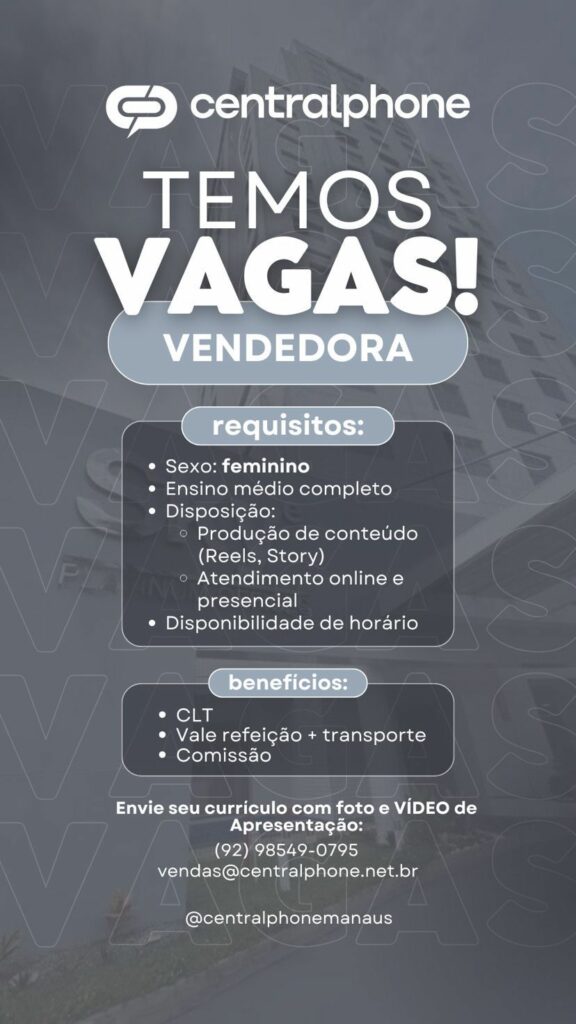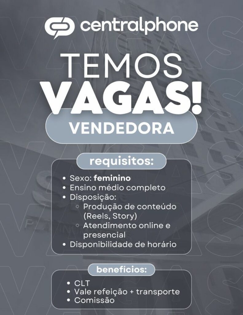 Central Phone está selecionando Vendedora; Envie seu currículo!