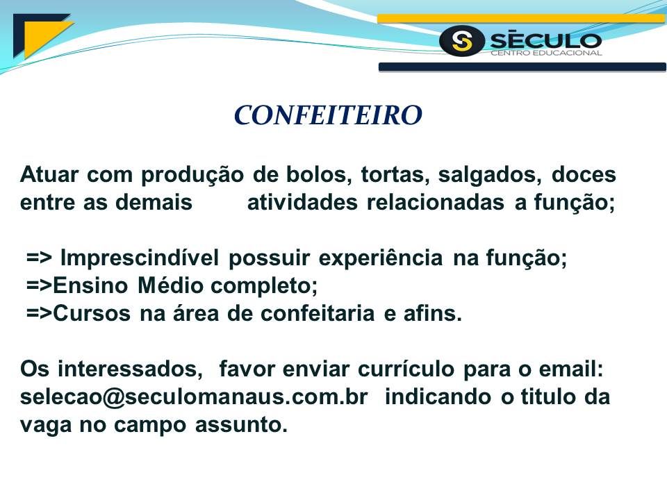 Centro educacional século contrata Confeiteiro; Envie seu currículo!