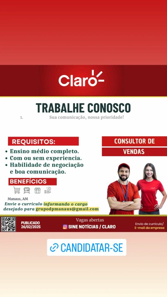 Claro está selecionando Consultor (a) de vendas; Envie seu currículo!