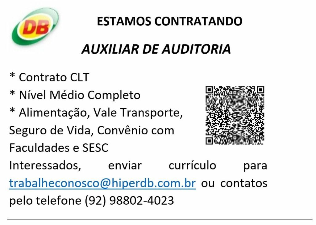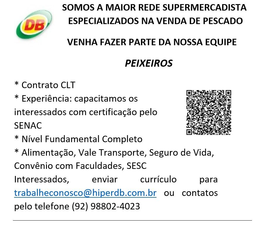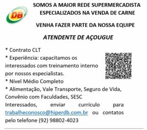 DB Está selecionando Vendedor, Atendente de açougue, Auxiliar de auditoria, Peixeiros; Envie seu currículo!
