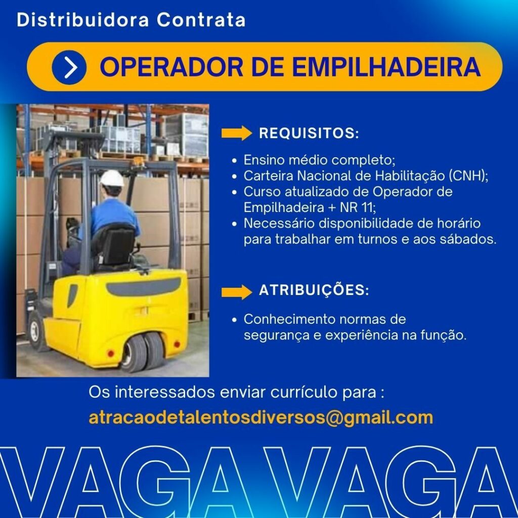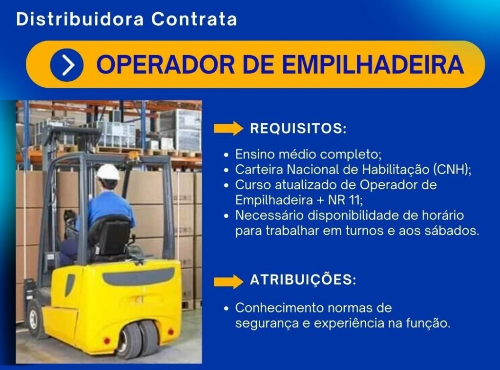 Distribuidora deseja contratar Operador de empilhadeira; Envie seu currículo!
