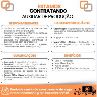 DJB Indústria está selecionando Auxiliar de produção; Envie seu currículo!