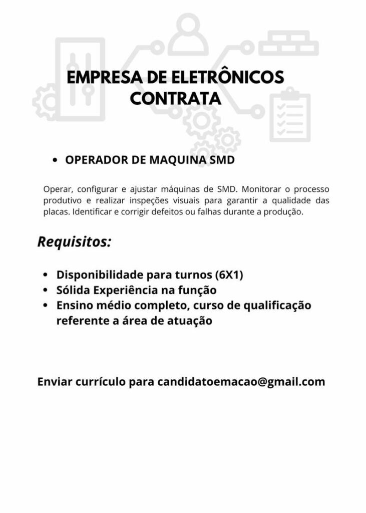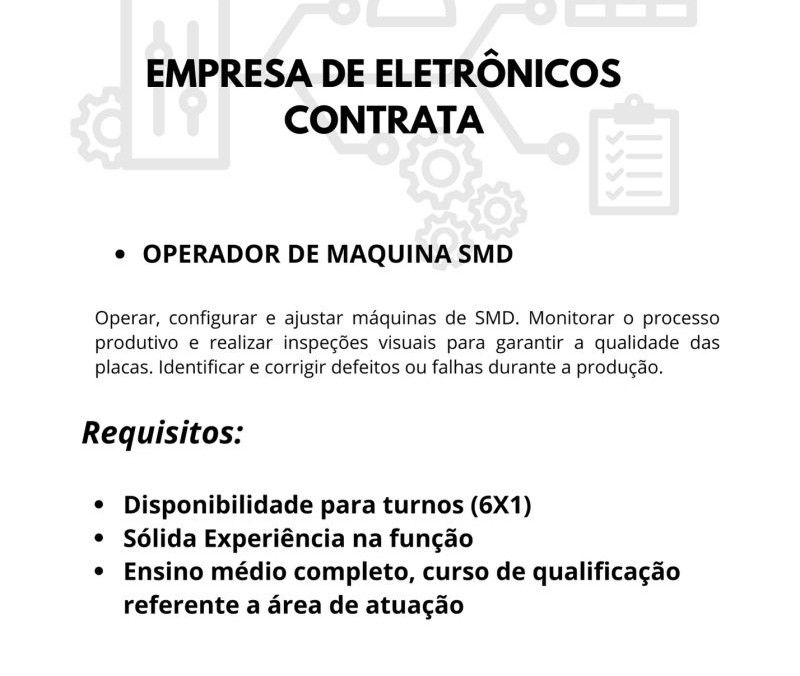 Empresa de eletrônicos contrata Operador de máquina SMD; Envie seu currículo!