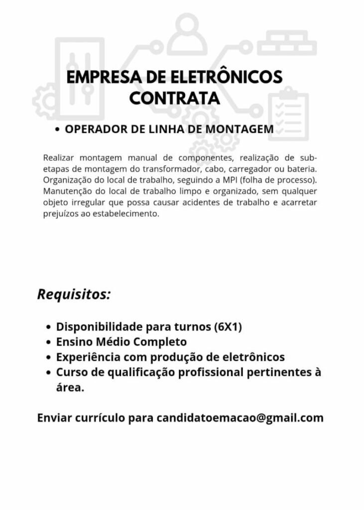 Empresa de eletrônicos seleciona Operador de linha de montagem; Envie seu currículo!