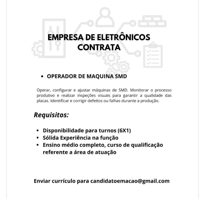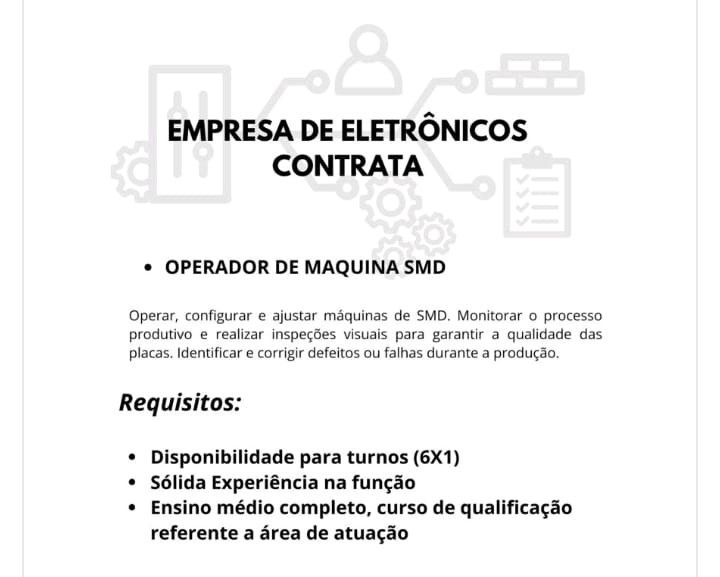 Empresa de eletrônicos seleciona Operador de smd; Envie seu currículo!