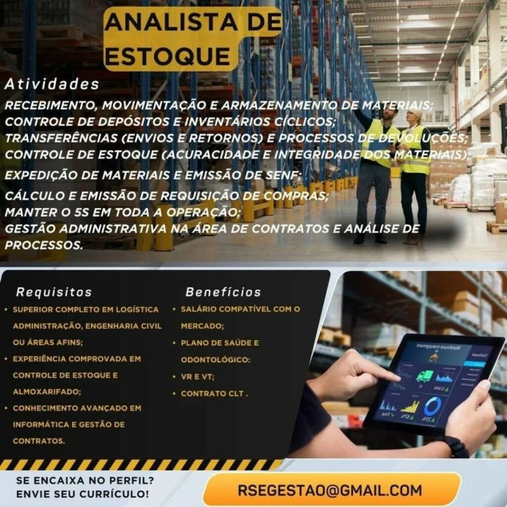 Empresa está selecionando Analista de estoque; Envie seu currículo!