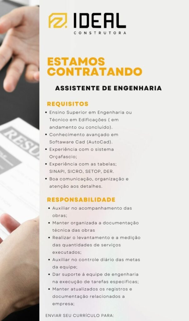 Empresa está selecionando Assistente de engenharia; Envie seu currículo!